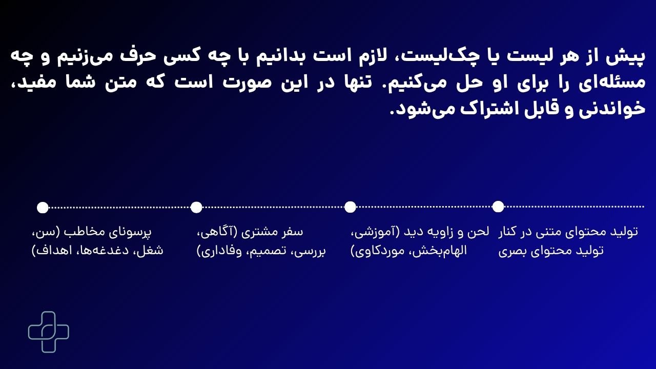 پیش از هر لیست یا چک‌لیست، لازم است بدانیم با چه کسی حرف می‌زنیم و چه مسئله‌ای را برای او حل می‌کنیم. تنها در این صورت است که متن شما مفید، خواندنی و قابل اشتراک می‌شود.